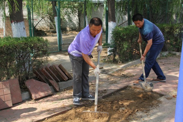 6月15日,郭強、段建平等幾名老同志主動到職工菜地勞動,為菜地除草、澆水。當(dāng)發(fā)現(xiàn)菜地一角堆積了一些廢舊磚塊時,幾名老大哥一商量,干脆廢物利用,用這些磚塊為職工鋪一條采摘小路,大家紛紛表示贊同并積極加入勞動隊伍。小路修好后,干勁高漲的人們又一鼓作氣對“鼓包”的方磚路面進(jìn)行了修整。