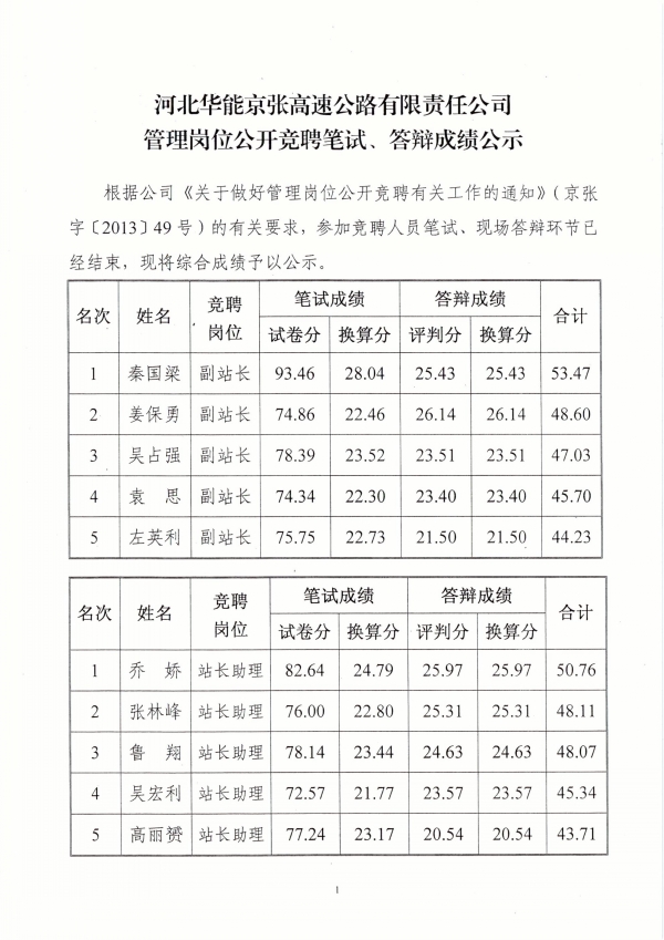 管理崗位公開競(jìng)聘筆試、答辯成績公示