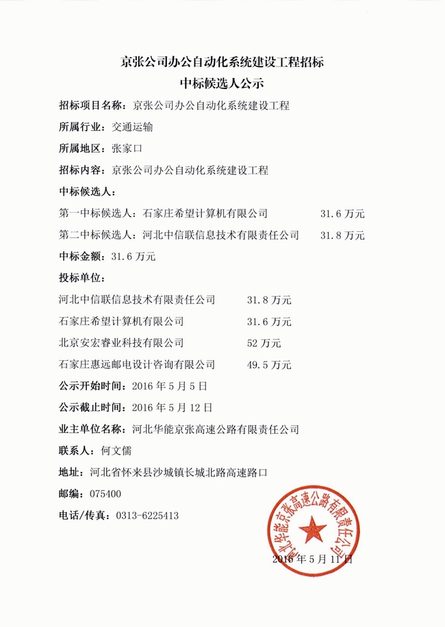 京張公司辦公自動化系統(tǒng)建設(shè)工程招標(biāo)中標(biāo)候選人公示